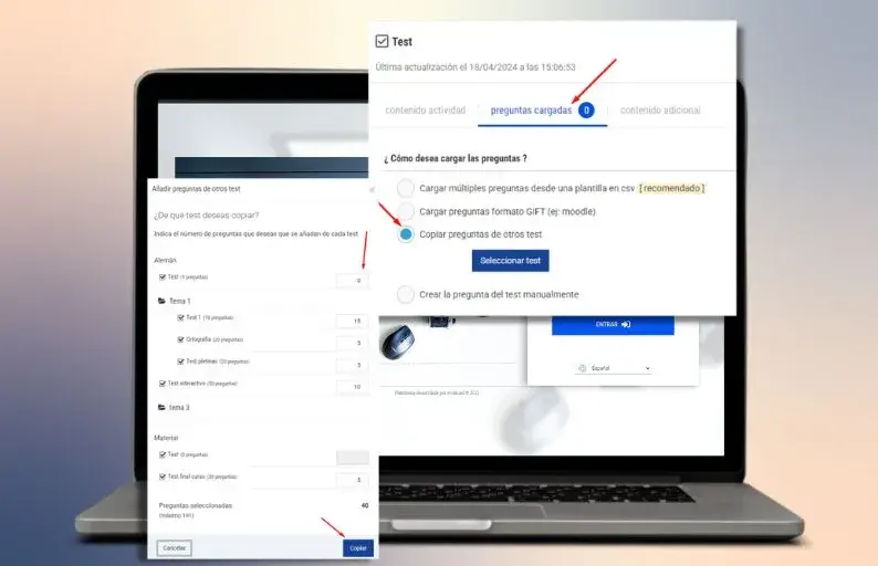 Hemos añadido una nueva funcionalidad que permite diseñar pruebas de test para los alumnos utilizando preguntas de otros test del curso. Al crear una actividad de examen, se puede copiar preguntas de otras pruebas, seleccionando las asignaturas o temas y el número de preguntas a incluir de cada uno.