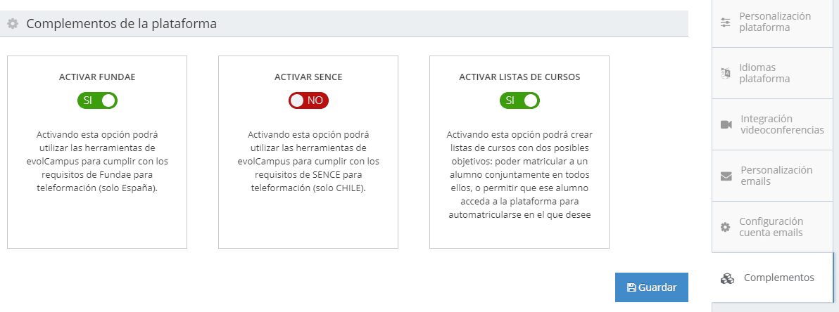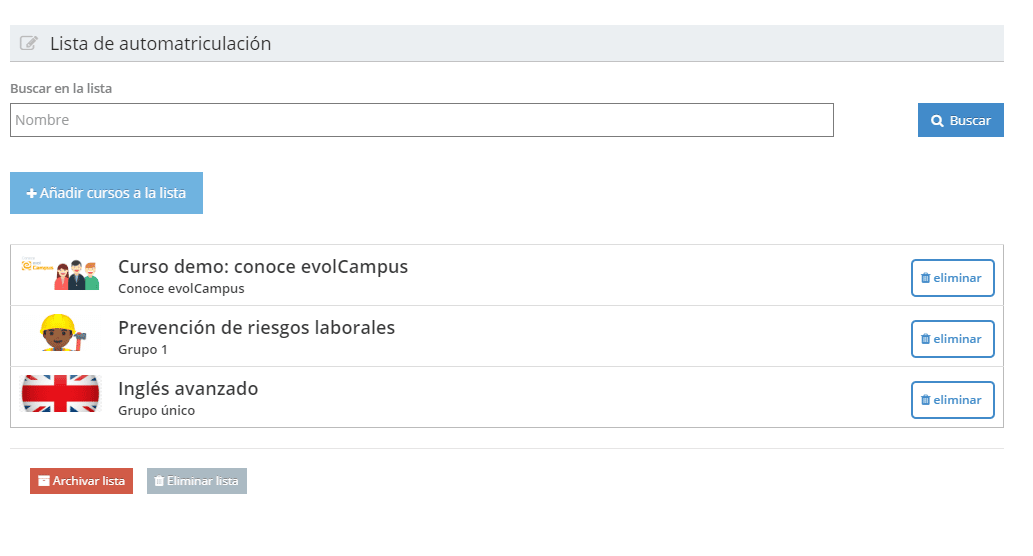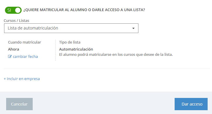 - Lista de automatriculación permite dar acceso al campus a un alumno para que pueda automatricularse a los cursos de la lista que desee