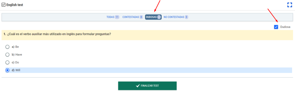 A partir de ahora, cuando un alumno realice un test (incluyendo test de entrenamiento) y tenga dudas sobre cuál es la respuesta correcta, podrá marcar las preguntas que desee como dudosas, lo que le ayudará a poder repasarlas de manera sencilla antes de enviar el test.