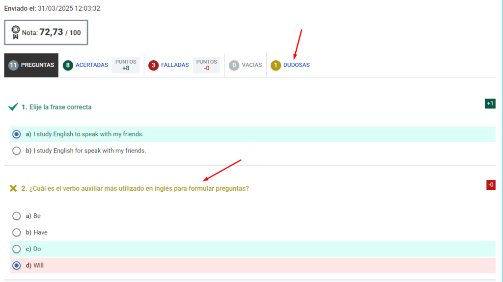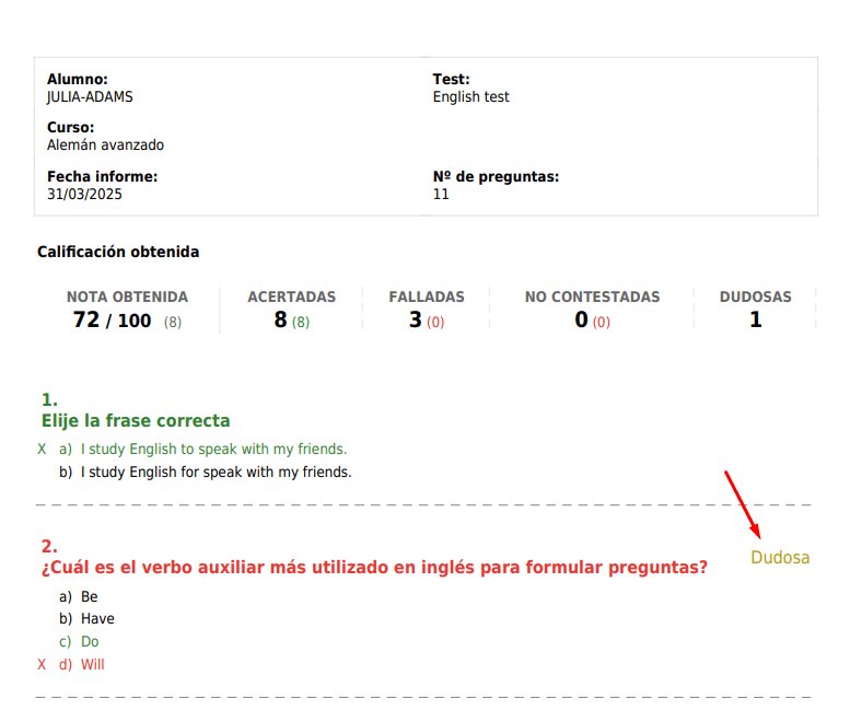 Después de enviar las respuestas, cuando un alumno vea el test realizado, podrá ver igualmente aquellas preguntas que ha marcado como dudosas: