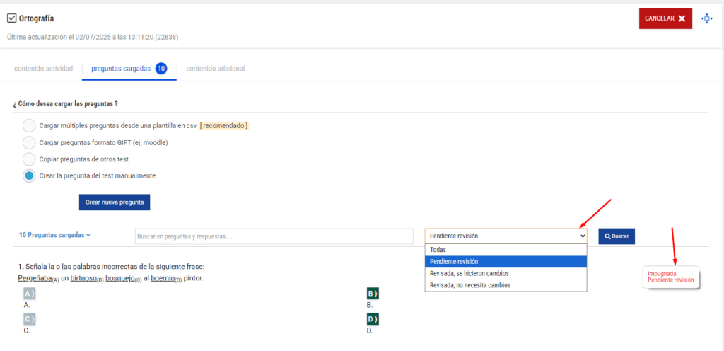 Además de la funcionalidad que ya tenemos, a partir de ahora, desde la pantalla donde se encuentran cargadas las preguntas, al filtrar por aquellas preguntas que han sido impugnadas, como novedad tendremos un desplegable donde se pueden seleccionar diferentes estados en función de si ya se han gestionado o no: