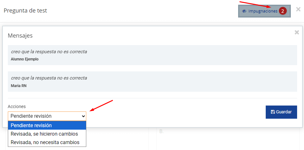 Si hacemos clic en el recuadro que nos indica el estado, podremos ver el número de impugnaciones de cada la pregunta, así como los mensajes enviados por los alumnos: