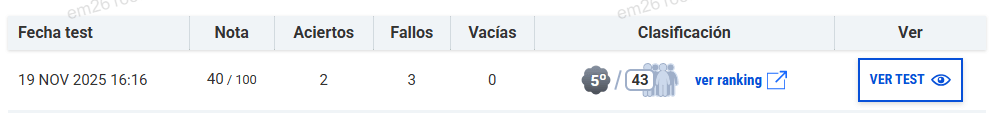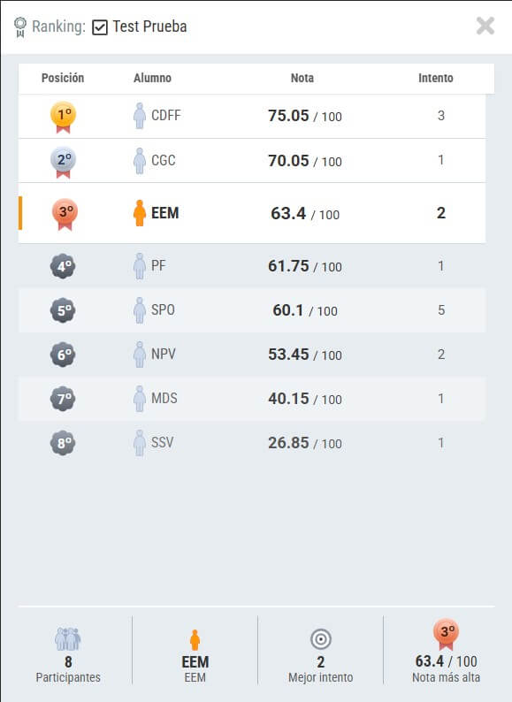 Cuando un alumno realice el test podrá ver la posición que ha obtenido en el mejor intento que realice respecto a los resultados del resto de alumnos que hayan realizado el ejercicio: