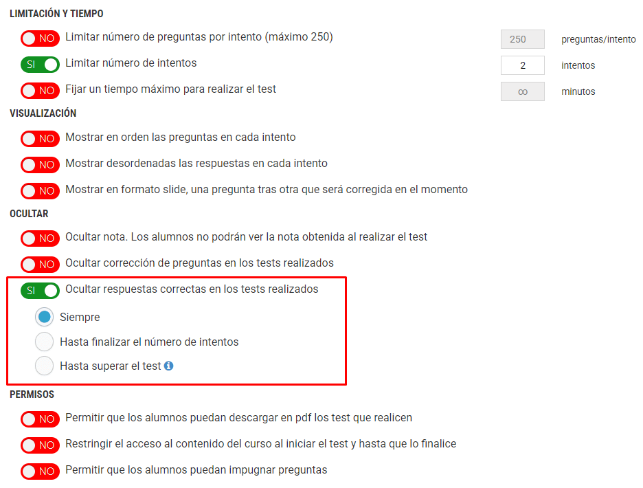 Hemos añadido una nueva posibilidad en la configuración de los test para que los alumnos puedan ver en qué preguntas han fallado sin ver cuáles son las respuestas correctas.