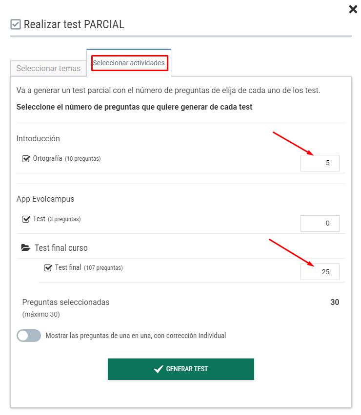 Para ello, solo deben seleccionar la pestaña «seleccionar actividades» que les permitirá elegir el número de preguntas específico a seleccionar de cada test, teniendo en cuenta el máximo permitido que haya configurado: