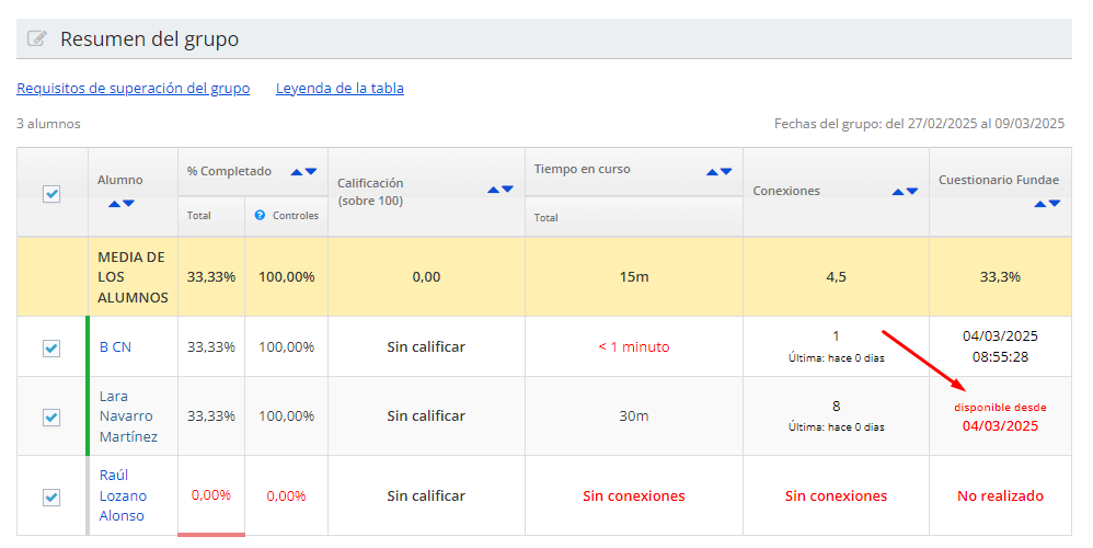 Por otra parte, y para facilitar una correcta identificación de los cuestionarios que han sido entregados a los alumnos, en la columna «Cuestionario Fundae» del informe «Resumen de grupo», además de ver la fecha en que ha sido cumplimentado, tendremos información previa de desde cuándo lo tienen disponible para rellenar.