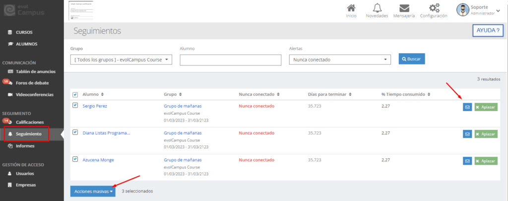 Así, podéis personalizar fácilmente este tipo de mensajes cuando, por ejemplo, algún alumno todavía no se ha conectado al curso, o quedan pocos días para que finalice y alguno de ellos no lo ha completado con éxito.