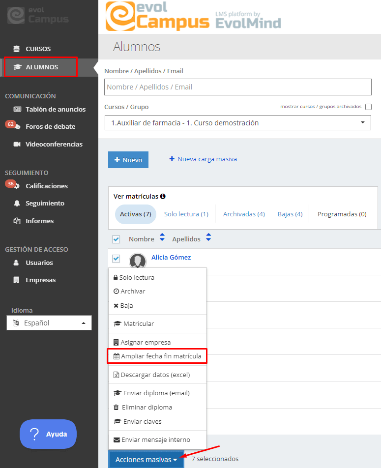 3) Clicar el desplegable del botón «Acciones masivas» => Ampliar fecha fin matrícula.