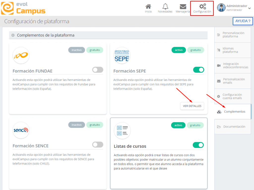 Por otra parte, podéis ver sus datos de acceso en el complemento de Formación SEPE que estÔ disponible en el menú de «Configuración=>»Complementos»: