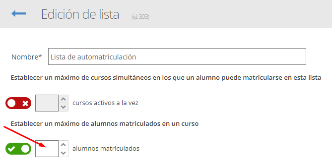Para ello, al crear una lista encontraréis un nuevo apartado donde se puede indicar el número máximo de alumnos que podrán matricularse en el/los cursos que contiene la lista: