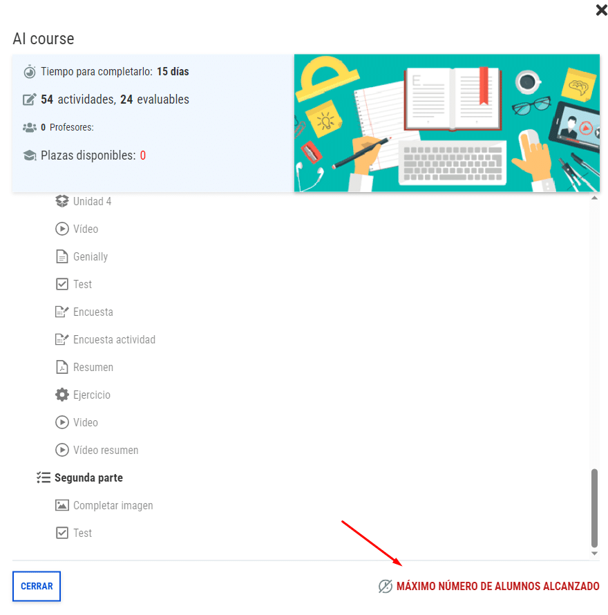 Si un alumno intenta matricularse en un curso que ya ha alcanzado el cupo máximo, no podrá acceder y, en su lugar, verá un texto informativo indicándole que se ha alcanzado el número máximo de alumnos en el curso: