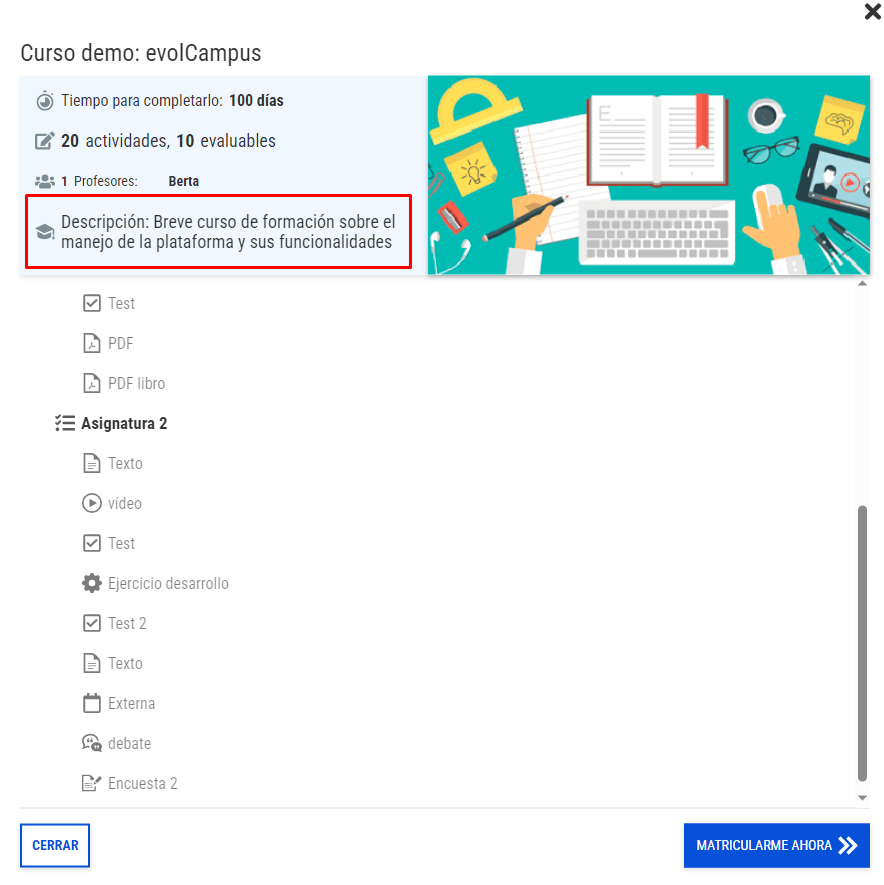 Esta descripción únicamente estará disponible si se tiene activo el complemento de «listas de cursos« en la plataforma y se mostrará en el campus del alumno en caso de que el curso forme parte de una lista de automatriculación, junto con información básica del curso, como el tiempo para completarlo o las actividades que lo componen: