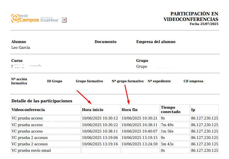 De este modo, además del tiempo total de conexión del que ya disponíamos, podemos justificar las horas exactas en las que un alumno se ha conectado y desconectado, además de ver las posibles desconexiones durante la videoconferencia.