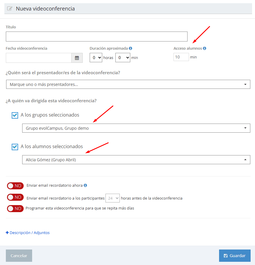 Os anunciamos dos nuevas opciones que hemos incorporado recientemente en la creación de nuevas videoconferencias:Ahora ya es posible invitar en una misma videoconferencia a un grupo de alumnos y, al mismo tiempo, seleccionar uno o más alumnos de otros grupos a nivel individual.Además, se puede elegir el tiempo de antelación con que se permite entrar a los alumnos. Suprimiendo los tiempos de espera, los tiempos de conexión de cada sesión se mostrarán con mayor exactitud.