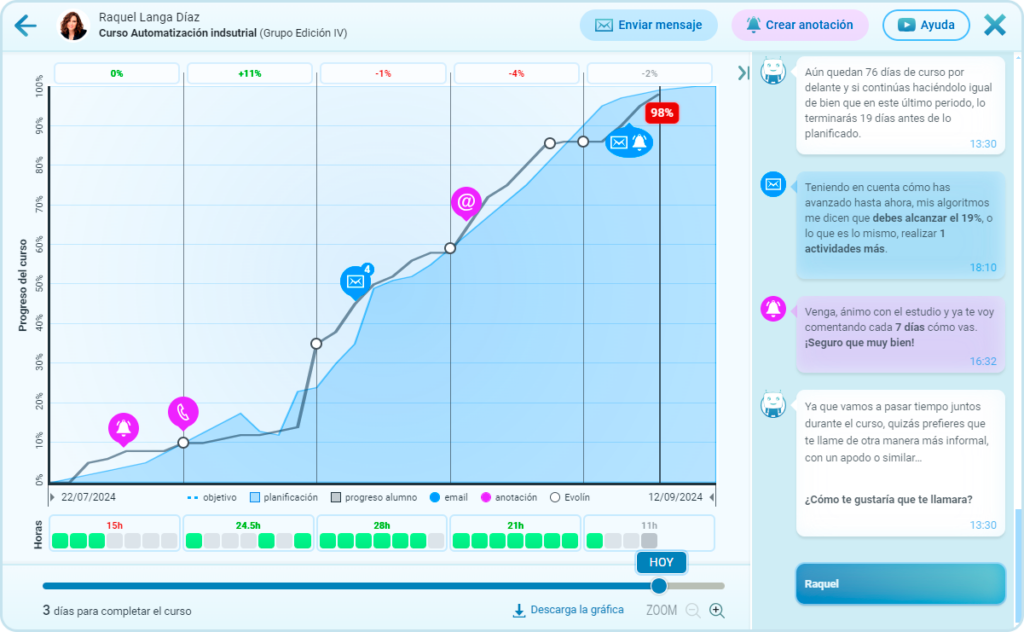 - Mejora progresión del alumno y la tasa de finalización, dividiendo el curso en pequeños objetivos que deberá alcanzar para completarlo a tiempo.