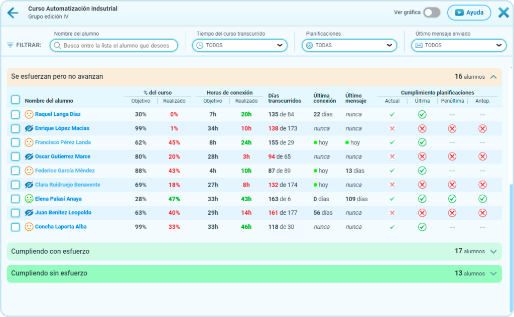 - Permite diferenciar visualmente qué alumnos están avanzando correctamente o aquellos que están en riesgo de no completar el curso, pudiendo actuar antes de que sea tarde.